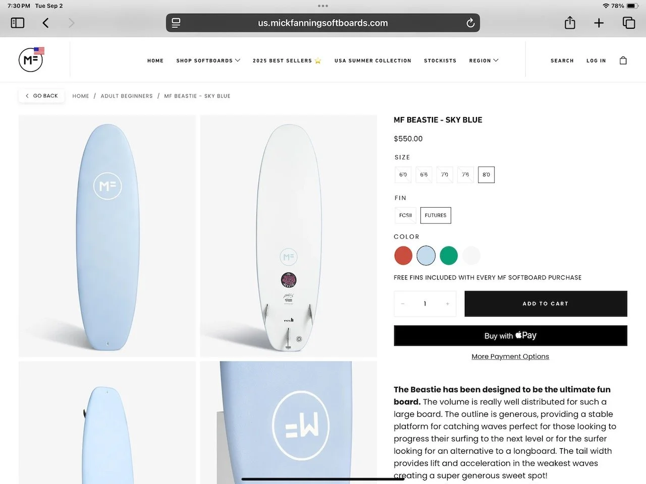 Specifically, the Mick Fanning Epoxy Lam Beastie model represents the pinnacle of functional foam board design. This isn't just any Mick Fanning board—it's the one with real fin boxes (both FCS II and Futures options) and proper fins, not the cheaper versions with holes in the deck and floppy plastic fins that break constantly.