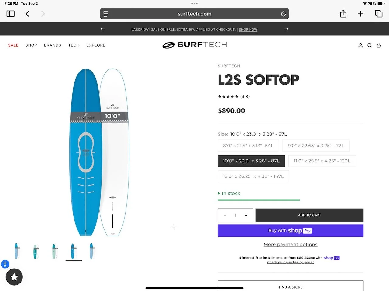 Surf Tech L2S: $810 for 8'0", $890 for 10'0"