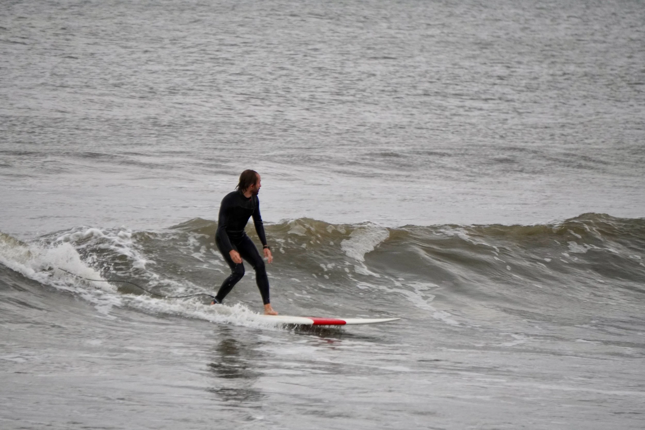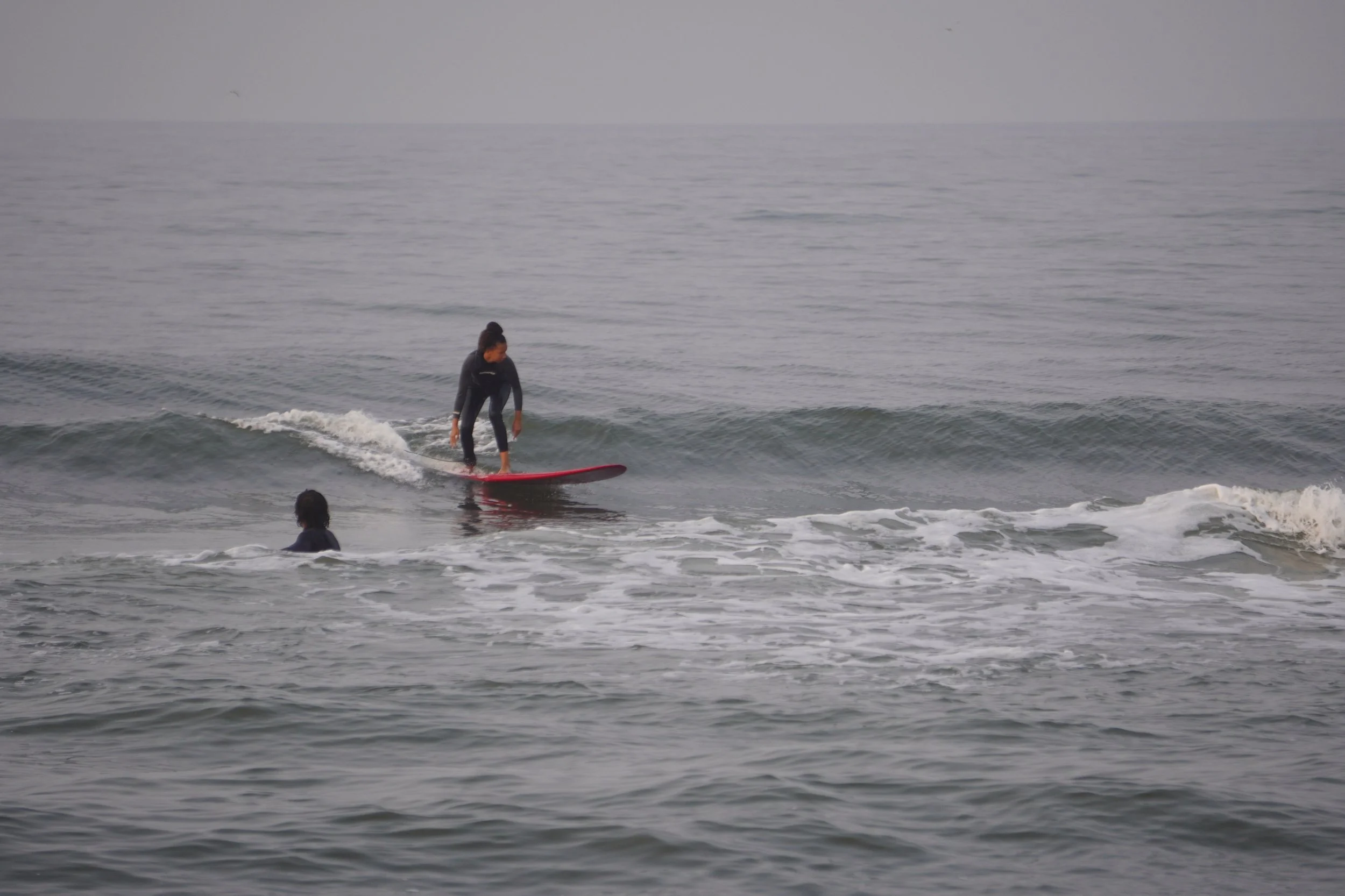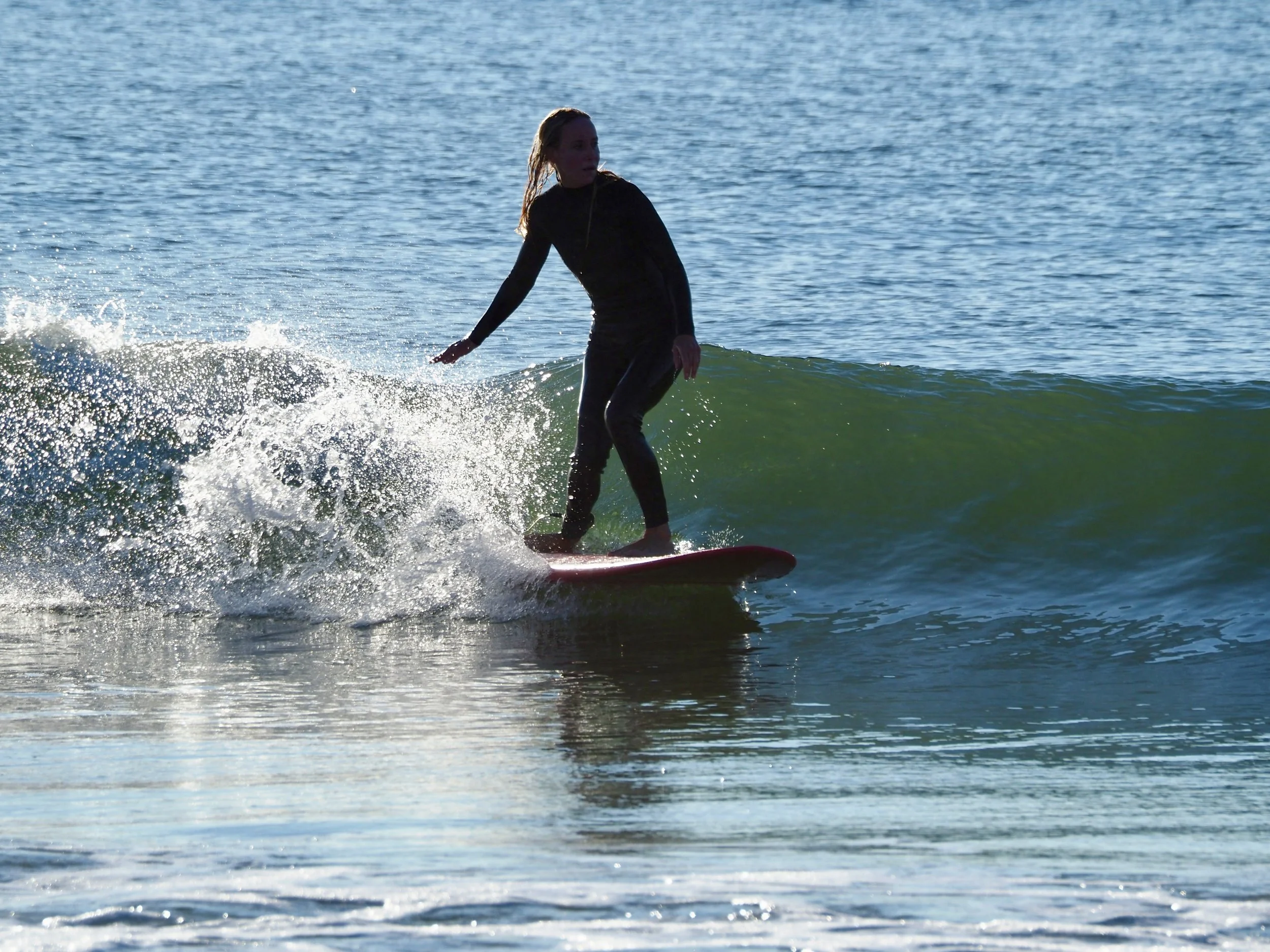 Claudia feeling the glide on a hard, fiberglass surfboard.